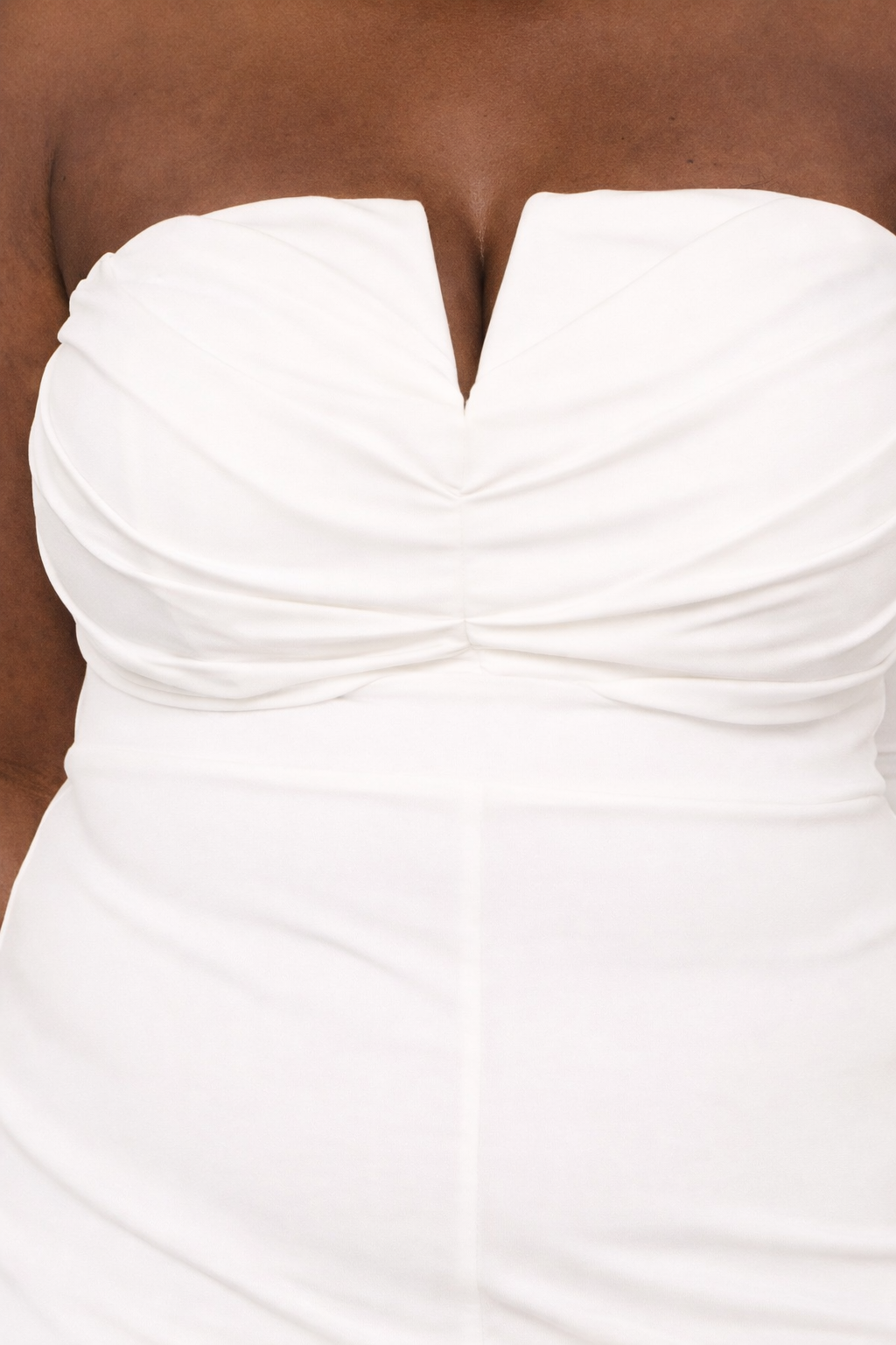TUBE TOP PLUS BRIDAL DRESS DEEP V-NECK ZIPPER BACK MODEL: 5'8" 1XL95%POLYESTER 5%SPANDEX LINING:100%POLYESTER