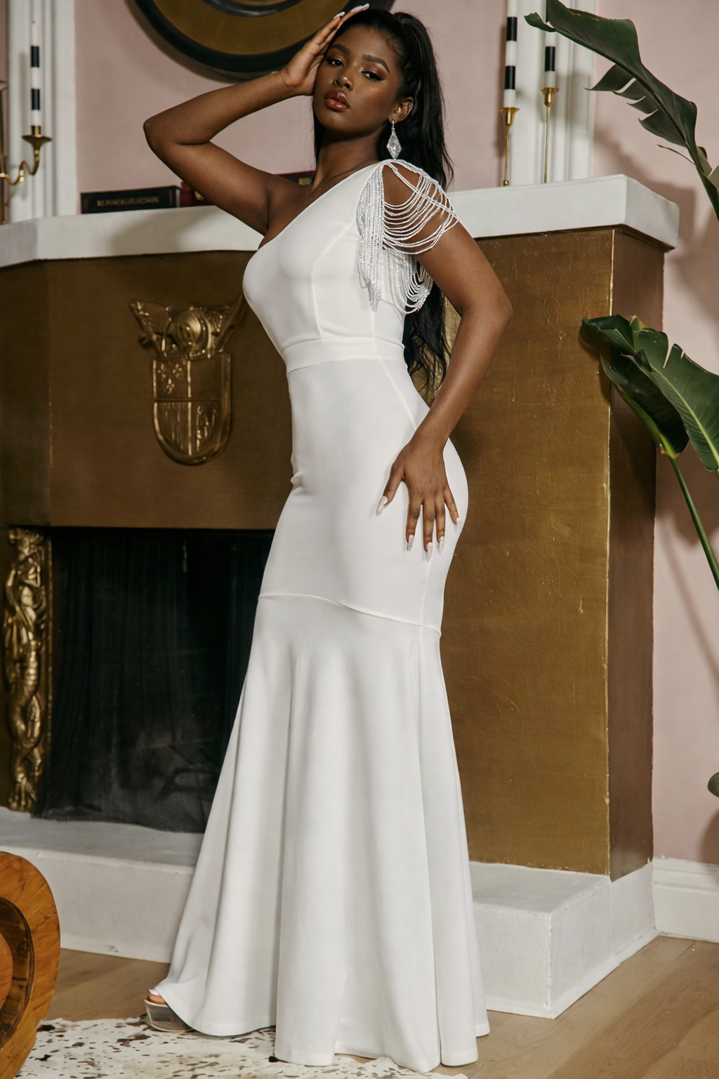 BEADED SLEEVE ONE SHOULDER MAXI DRESS MERMAID DDRESS ZIPPER BACK MODERATE STRETCH FITS TRUE TO SIZE MODEL: 5'8" SMALL SELF: 95% POLYESTER 5% SPANDEX /LINING : 100% POLYESTER